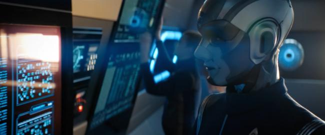 Erfreulicherweise hat man das Geheimnis rund um Cylonen-Airiam nicht unnötig in die Länge gezogen. Gerade noch ist sie deutlich sichtbar vom Zukunfts-Matrix-Sonden-Monster infiziert worden, ein paar mysteriöse leuchtende rote Augen zwischendurch reingeschnitten, und schon liefert Star Trek: Discovery eine Auflösung. Zumindest ein wenig.