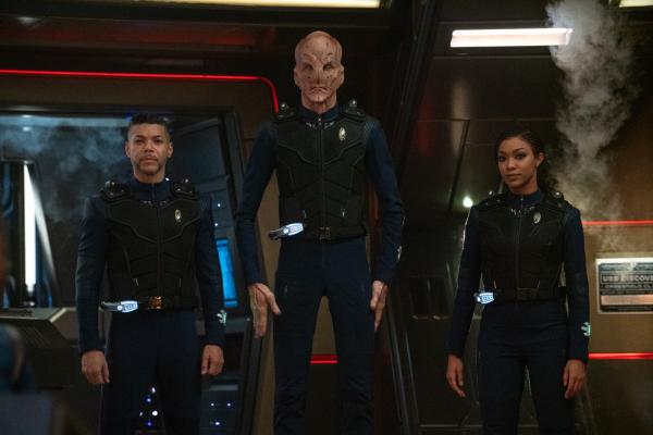 Besuche aus der Außenwelt wurden direkt im Design des Programms eingeplant - sei es als Rettungsmission oder feindlich Gesinnte. Optisch werden alle “Eindringlinge” erst einmal der Hologram-Welt angepasst. So wird aus Burnham mal eben ein Rotkäppchen-Trill, aus Culber ein Bajoraner mit Ohrschmuck (der die ganze Folge über auch immer mal wieder schön weihnachtlich klimpert), und Saru tritt als Mensch in Erscheinung. Die Rollenspielgruppe ist komplett. Warum die anderen beiden nicht auch einfach Menschen bleiben konnten, wird nicht erklärt, aber ich möchte das auch nicht hinterfragen, immerhin bekommen wir so seltene Momente, in denen Doug Jones’ Gesicht selbst zu sehen ist.