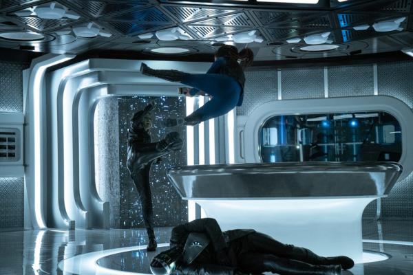 Die Discovery ist eine Tardis - innen größer als außen. Schwanke noch, ob ich darum bitte, dass mir einer das Turbolift-System erklärt, oder ob ich gar nicht wissen will, ob das Gezeigte funktionieren kann. Sicher ist, dass das Schiff sehr viel größer sein müsste, um ein derartiges Netzwerk zu beherbergen. Aber eine optisch ansprechende Umgebung für weitere Zweikämpfe (Burnham versus Regulator, Booker versus Zareh) nebst extremes Parkour-Training ist es allemal.