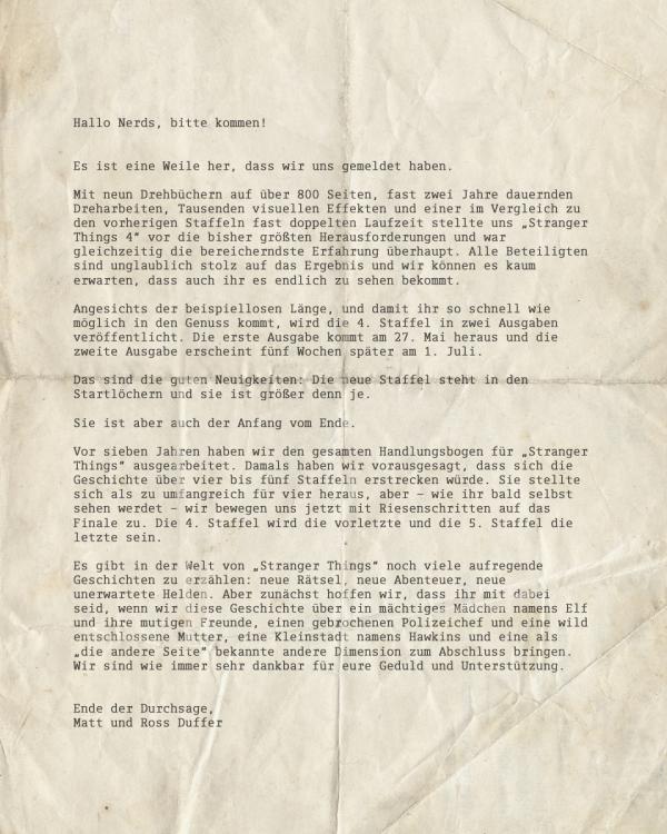 Gleichzeitig kündigten die Duffer-Brüder in ihrem Brief aber auch an, dass dies der Anfang von Ende sei. Vor sieben Jahren hätten sie den gesamten Handlungsbogen für Stranger Things ausgearbeitet. Geplant war eine Geschichte, die sich über vier bis fünf Staffel erstrecken würde. Nun habe sich herausgestellt, dass die Geschichte zu umfangreich für vier Staffeln sei. Damit wird Staffel 4 die vorletzte werden, bevor Stranger Things dann mit Staffel 5 zu Ende geht.